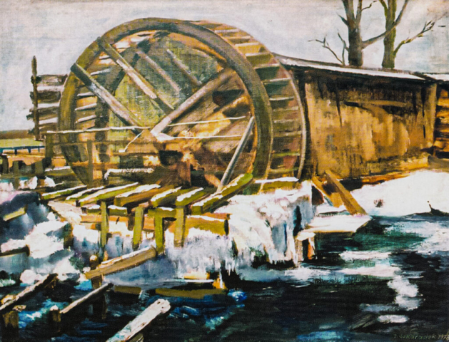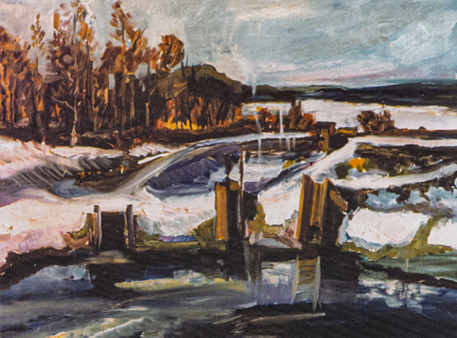 - Budowa zapory wodnej, 1966, olej na płycie 54×120 cm